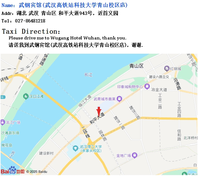 Wugang Hotel Wuhan is located in the south of the Bank of the Yangtze River, the intersection of Wuchang District and Qingshan District, and connected with the Second Yangtze River Bridge in Wuhan in the West. The hotel is only ten minutes' drive from Wuhan railway station, and the transportation is very convenient.